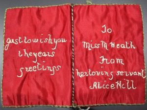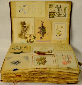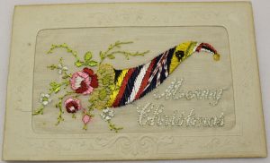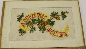 Before the days of mass production of Christmas cards, many were hand-made. The Museum has several examples with just three illustrated here. The first two date from the First World War. The date of the completely hand made card from a servant to her mistress is not known. We also hold a leather bound album of late Victorian/early Edwardian greetings cards many of which show impressive craftmanship.