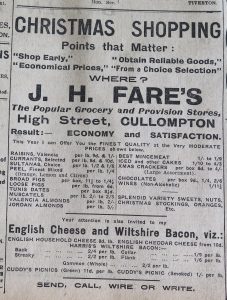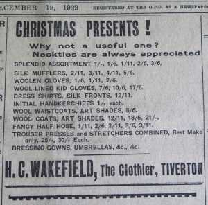 December 1922 continues with more adverts from the Gazette in the couple of weeks leading up to Christmas. They show the variety of loose goods on sale in a Cullompton grocery and an Exeter toy shop hoping to attract customers from the Tiverton district. ‘ Peter Pan’s Cave’ declares that it doesn’t sell goods made in Germany presumably harking back to the First World War which would still have been very fresh in people’s memories.