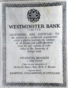 The Tiverton & District Directory of 1923, which we hold in our Library, indicates that as well as these two banks there were branches of the National Provincial, the London Joint City and Midland Bank and the Devon and Exeter Savings Bank. Also listed is a ‘private’ bank, Fox, Fowler & Co which had been founded by serge maker, Thomas Fox in Wellington in 1787. In 1921, this bank merged with Lloyds but still had a branch operating in Tiverton.
