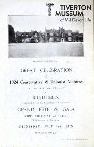 The ‘elaborate arrangements’ for the visit of the Prime Minister, Stanley Baldwin, to Bradfield, near Uffculme, on July 1st 1925, were outlined in the Gazette. Bradfield, at that time, is described as ‘the residence of the Hon. Mrs Adams. It was anticipated that this would be the largest political ‘gathering’ in the West for over 30 years. Special trains were being organised from all over the region along with GWR’s own fleet of 50 ‘motor omnibuses’ for the final leg to Bradfield. A programme of sports was being arranged to include a tug o’war knock-out, a tennis tournament and ‘aquatic sports’ on the lake. Four local bands were booked and the whole day was to be rounded off with fireworks some time after 9.30pm.