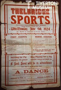 Most of these local events featured Tugs o’ War. Willand Sports and Races sound a bit more formal as both their Athletics and Equestrian events are advertised as being run under National Laws and Rules. The most intriguing race was to be run at Clyst Hydon on horseback the ‘Bun and Cigarette Race’! If any one has any idea what this entailed, please let us know.